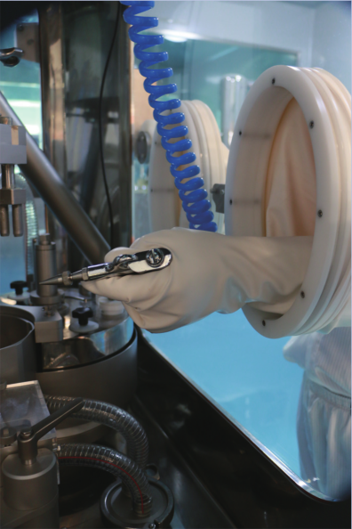 The inlet and outlet of the highly active powder is conducted through the sealing αβ valves. The containment cavity adopts the inflatable sealing, and does not deflate after power off, ensuring complete sealing and production area isolation.